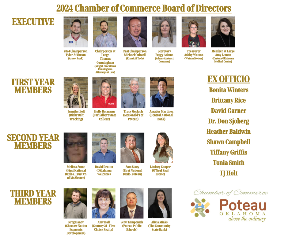 The Executive Committee and Board of Directors of the Poteau Chamber of Commerce are comprised of business leaders who are devoted to making a difference in our community and the surrounding area today, tomorrow and the future.